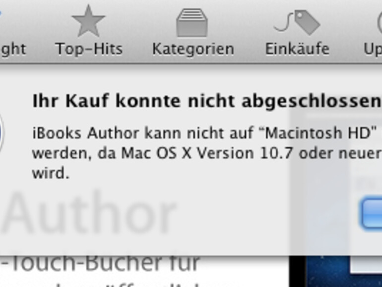 Versucht man unter OS X 10.6.8 den iBooks Author im Mac App Store herunterzuladen, heißt es „der Kauf konnte nicht abgeschlossen werden, da Mac OS X 10.7 oder neuer benötigt wird.“ Doch der Mac App Store lässt sich problemlos austricksen und die Installation erfolgreich durchführen.