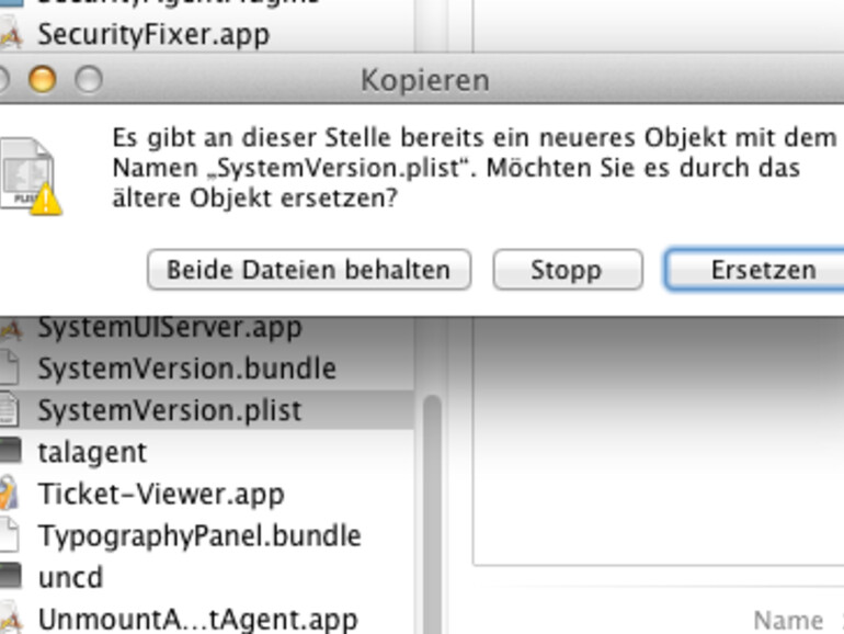 Wenn der Download abgeschlossen ist, können Sie die Kopie von SystemVersion.plist von Ihrem Schreibtisch wieder in den Ordner /System/Library/CoreServices bewegen und die von Ihnen zuvor geänderte Datei in ihren Originalzustand wiederherstellen.