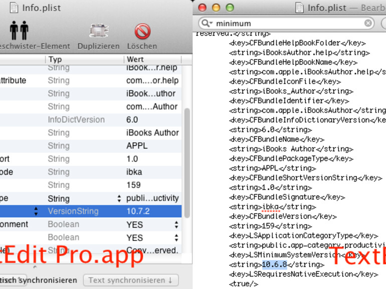 Klicken Sie im letzten Schritt mit einem Rechtsklick auf iBooks Author.app im Finder und wählen Sie Paketinhalt zeigen. Öffnen Sie dann unter im Ordner Contents die Datei Info.plist – erneut entweder mit TextEdit oder einem Plist-Editor. Den Wert unter LSMinimumSystemVersion (TextEdit) oder Minimum system version (PlistEdit Pro) vorhandenen Eintrag 10.7.2 ändern Sie auf die 10.6.8. Speichern Sie die Datei und iBooks Author kann gestartet werden.