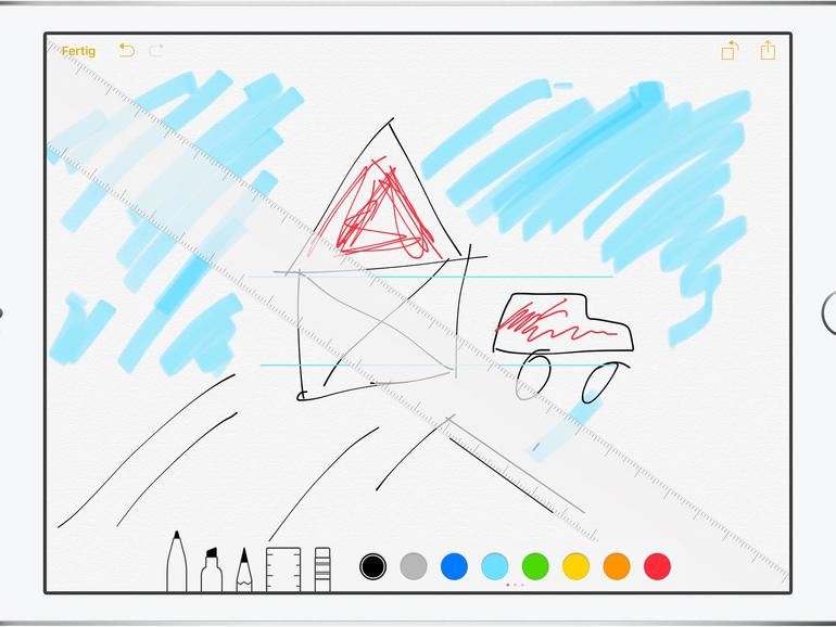 Mit iOS 9 hat Apple die Notizen-App vollständig überarbeitet. Sie funktioniert jetzt wie ein digitaler Notizblock, inklusive einer Zeichenfunktion. Probiere es aus: Öffne die Notizen-App und nicke, sofern du auf allen Endgeräten bereits iOS 9 oder Mac OS X 10.11 „El Capitan“ einsetzt, den Hinweis zur Aktualisierung ab. Erstelle jetzt eine neue Notiz und tippe rechts unten auf das kleine Schlangenlinien-Symbol: Es öffnet sich eine kleine, aber außerordentlich präzise Zeichen- und Malfunktion mit verschiedenen Stiften und Farben, deren Inhalte nahtlos per iCloud auf Macs und andere iOS-Geräte übertragen werden.