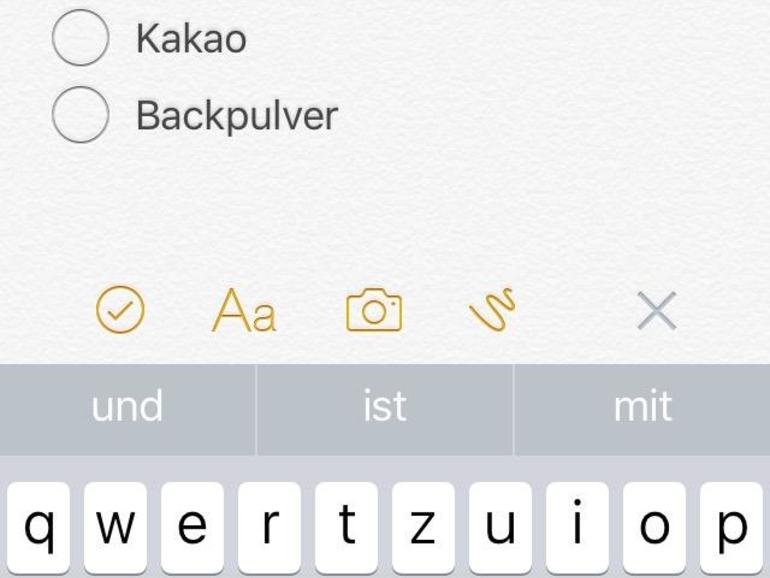 Mit der Notizen-App lässt sich nicht nur wunderbar zeichnen – bei Bedarf kannst du hier auch praktische To-Do-Listen anlegen, etwa um einen Einkaufszettel zur Hand zu haben oder Projektfortschritte abzuhaken. Wie alle Notizen werden diese Listen natürlich auch per iCloud synchron gehalten. Öffne die Notizen-App und tippe rechts auf das „+“-Symbol. Tippe jetzt das Häkchen-Symbol an, um einen neuen To-Do-Listeneintrag zu erstellen. Mit der Eingabetaste legst du weitere Listenpunkte an.
