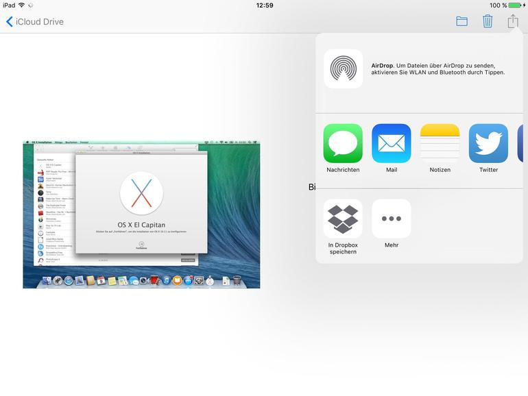 Wenn du Dateien bislang in der iCloud gespeichert hast, gibt es manchmal handfeste Gründe, sie in einen Cloud-Dienst wie Dropbox zu verschieben. Etwa, weil du nicht mehr zwei Cloud-Dienste nutzen möchtest oder weil du die Datei für jemanden zur gemeinsamen Bearbeitung freigeben möchtest. Bislang war das nur über den Export und das manuelle Verschieben in die Dropbox möglich, doch dank der iCloud-Drive-App (Siehe Tipp 5) können die Dateien nun direkt verschoben werden. Voraussetzung ist jedoch, dass die aktuelle Version der Dropbox-App installiert ist. Öffne die iCloud-Drive-App und tippe die zu kopierende Datei an. Es erscheint eine Vorschau mit Teilen-Optionen: Wenn du diese antippst, ist hier die Möglichkeit „In Dropbox speichern“ aufgelistet.