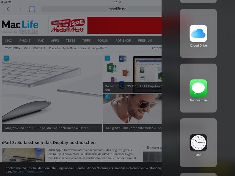 Zu den wohl praktischsten Neuerungen von iOS 9 zählen die neuen Mitteilungs-Features „Split View" und „Slide Over". Mit ihnen kannst du auf aktuellen iPads zwei Apps gleichzeitig im Bild halten und benutzen („Split View"), auf älteren Geräten zumindest zwischen zwei Apps im Bild wechseln („Slide Over"). Wische dafür einfach bei einer aktiven App, zum beispiel Safari, vom rechten Bildschirmrand ins Bild und wähle die App, die du nutzen möchtest. Wenn das nicht klappt, ist entweder dein iPad zu alt - oder du hast die Einstellungen nicht aktiviert. Diese findest du unter „Einstellungen" > „Allgemein" > „Multitasking" > „Mehrere Apps zulassen". Du kannst die Ansicht übrigens anpassen, indem du den Mittelbalken einfach weiter nach links oder rechts ziehst.