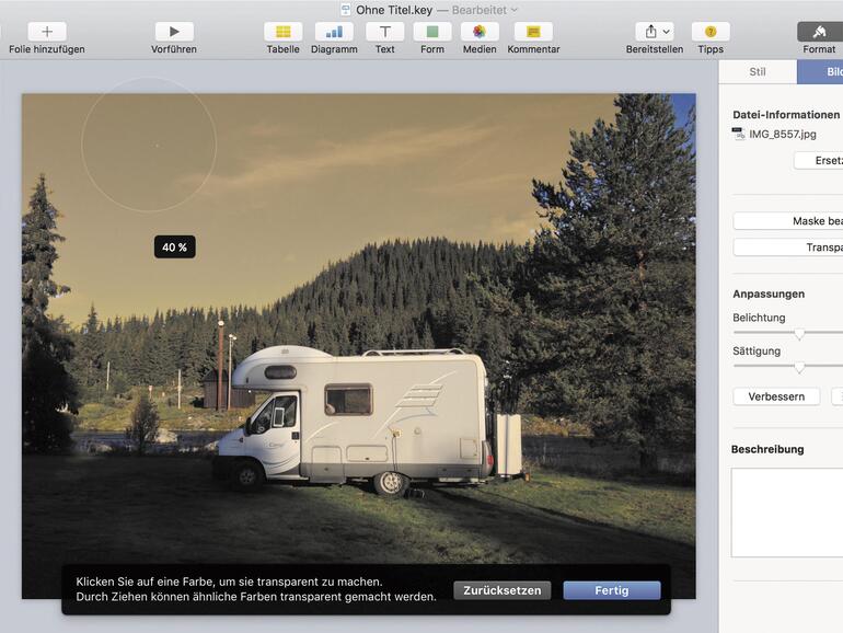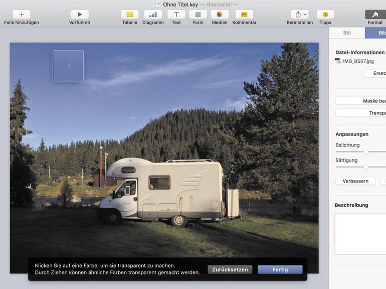 Platziere ein Bild in deinem Dokument und öffne den den Format-Inspektor (das Pinsel-Symbol). Öffne den Reiter „Bild“, klicke dort auf „Transparenz“ und platziere das Fadenkreuz über einer zu entfernenden Stelle.