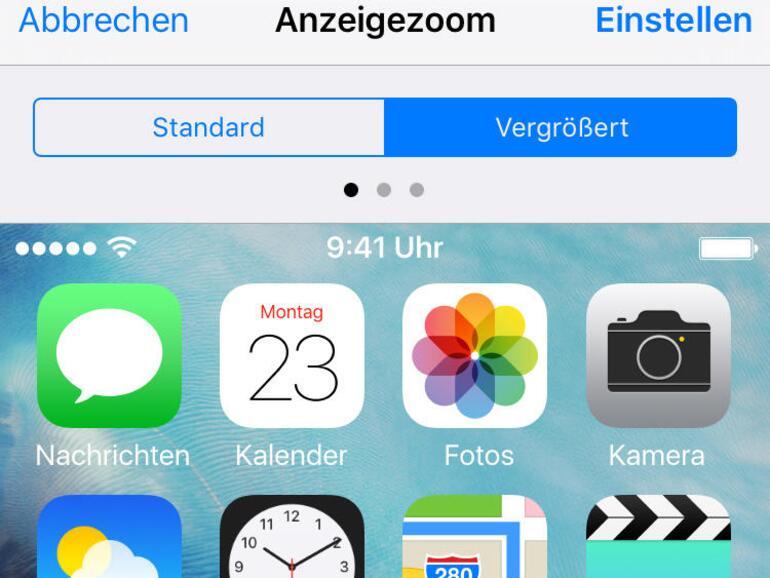 Ein Sonderfall sind die 6er-Modelle des iPhone. Mit Einführung des größeren Bildschirms des iPhone 6 hat Apple eine einfache Zoomfunktion integriert, die in etwa die Anzeige eines 4-Zoll-Gerätes auf die neue Displaygröße skaliert. Man hat die Wahl: mehr Arbeitsfläche oder größere Darstellung. Da einfach alles etwas vergrößert wird, verzichtet man aber auch auf einige Vorteile, zum Beispiel die Tatsache, dass auf dem iPhone 6 eigentlich 24 Apps auf den Bildschirm passen (ohne Dock). Mit dem Zoom entfällt eine Zeile. Es sind nur noch 20 Apps, genau wie auf einem iPhone 5 oder SE.