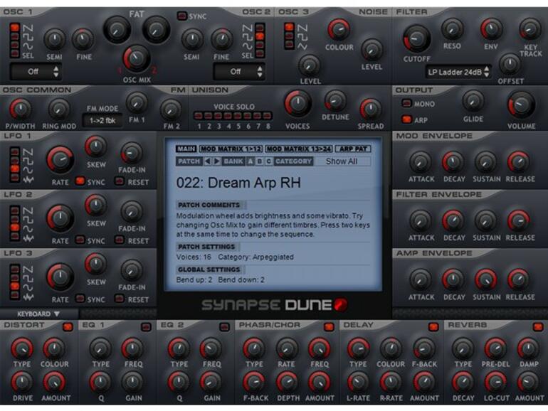 Auch filterseitig präsentiert sich Dune variabel: Bei dem Multimode-Filter stehen die Typen Tief-, Hoch-, Bandpass und Bandsperre sowie verschiedene Kombinationen zur Auswahl. Ein echtes Highlight stellt zudem die äußerst leistungsfähige Unison-Funktion mit bis zu acht, getrennt modulierbaren Unison-Stimmen dar. Ein dickes Lob verdienen ferner die umfangreichen Modulationsmöglichkeiten des Synthesizers. Drei LFOs, drei ADSR-Hüllkurven sowie eine komplexe Modulationsmatrix, über die alle Regler modulierbar sind, bringen Leben in Ihre Sounds. Auch die elegante, klar strukturierte Bedienoberfläche weiß auf ganzer Linie zu überzeugen. Richtig rund wird der Funktionsumfang durch eine umfangreiche Effektsektion sowie einen ausgefuchsten Arpeggiator.