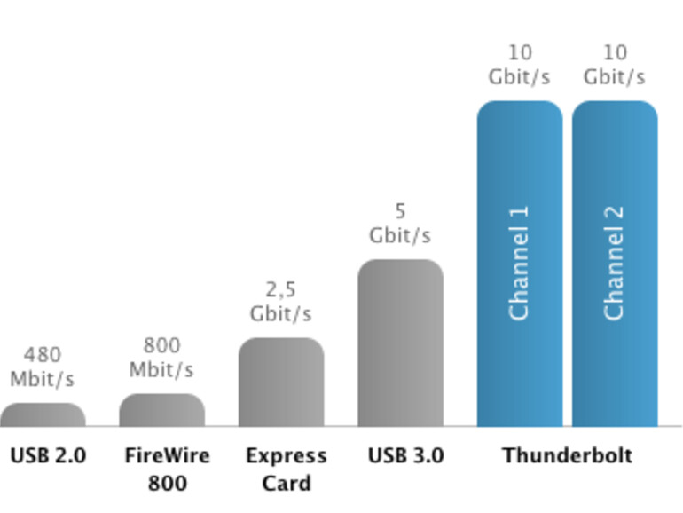 USB 3.0 und Thunderbolt: Apples neuer Highspeed-Standard mag USB 3.0 in Sachen Leistung zwar überlegen sein, der USB-Anschluss ist aber deutlich weiter verbreitet und passende Geräte um einiges günstiger