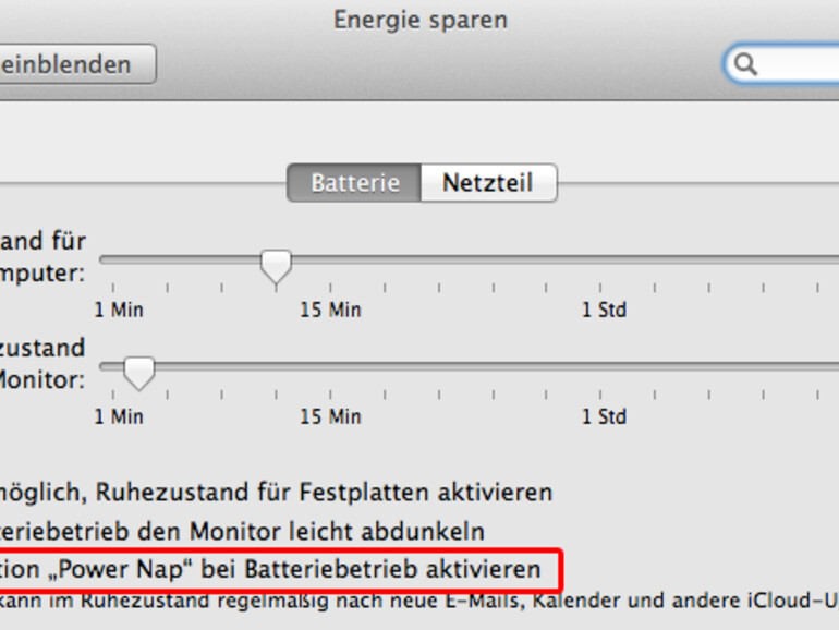 In den Systemeinstellungen unter Energie sparen lässt sich Power Nap auch bei Batteriebetrieb aktivieren. Automatische Downloads sowie das Time-Machine-Backup und die Spotlight-Indexierung sind im Batteriebetrieb jedoch nicht gestattet.