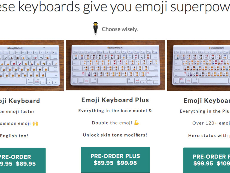 In Design und Layout dem Apple-Anwender nicht unbekannt, sind die drei von 80 bis 100 US-Dollar gestaffelten Tastaturen Emoji Keyboard, Plus und Pro voll auf den augenzwinkernden Diskurs im Textchat ausgelegt. Angebunden über Bluetooth, unterstützen sie das aktuelle OS X 10.11 sowie iOS 9.1 auf iPad und iPhone inklusive deren neueste Emojis. Markig wirbt der Hersteller: „Verbringe weniger Zeit damit, Such-das-Emoji zu spielen, und mehr Zeit damit, fantastisch zu sein.“