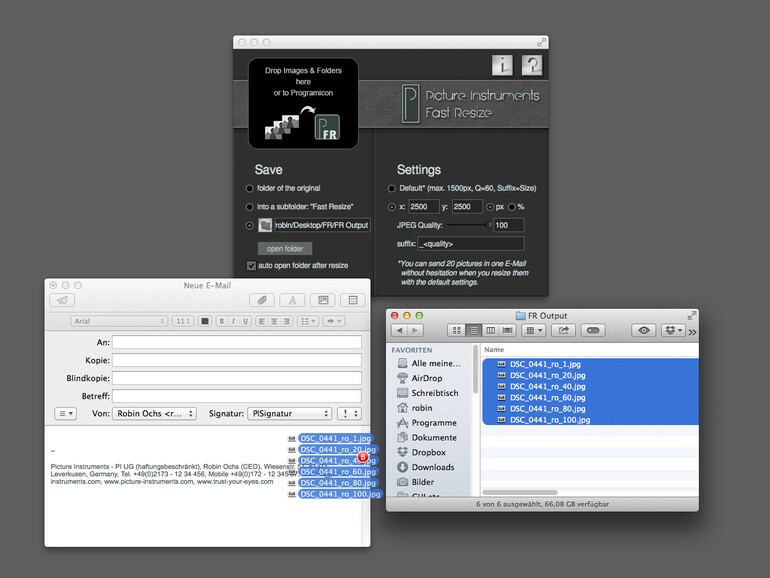 Die Fotos werden einfach alle via Drag and Drop auf die Programmverknüpfung gezogen und automatisch gemäß der hinterlegten Einstellungen skaliert und gespeichert. Auf Wunsch öffnet sich der Ordner mit den skalierten Bildern sogar automatisch, sobald der Prozess abgeschlossen ist. Die Originalbilder bleiben dabei unangetastet.