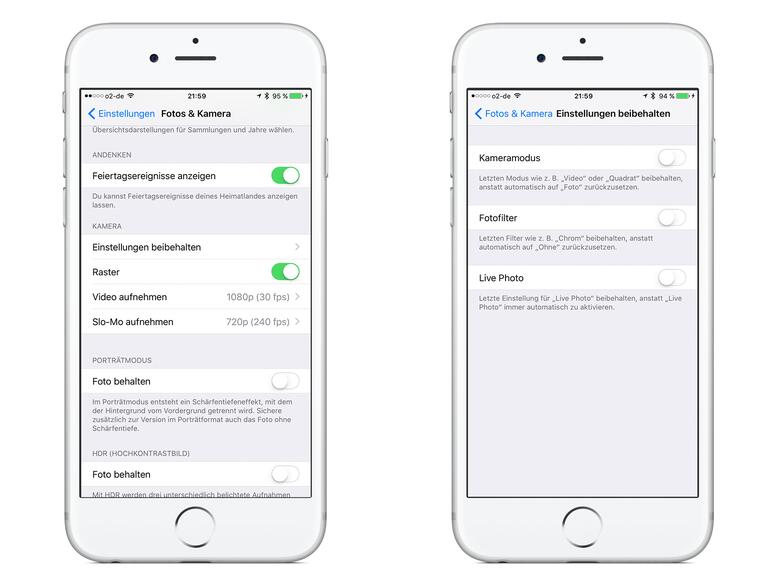 iOS 10.2 erlaubt es Kamera-Einstellungen beizubehalten. Konkret bedeutet das, dass etwa der letzte Kameramodus (Video, Quadrat, usw.) für den nächsten Start beibehalten wird und nicht automatisch zurück zu „Foto" wechselt. Gleiches gilt auch für verwendete Farbfilter. Auch die „Live Photo"-Einstellung kann hier konfiguriert werden.