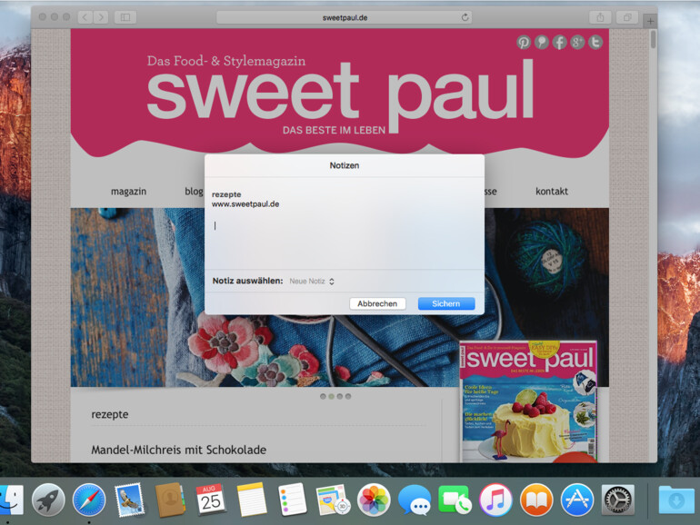 Egal ob Kochrezept oder Reiseplanung: Manchmal will man einer Notiz den Verweis auf eine Webseite hinzufügen. Öffnen Sie hierzu einfach die gewünschte Seite in Apples Webbrowser „Safari“ und klicken Sie dann auf das „Teilen“-Symbol gleich rechts neben der Adressleiste. Wählen Sie hier den Eintrag „Notizen“, um den Link in die „Notizen“-App zu übertragen. In der vorgeschalteten Eingabemaske können Sie weitere Informationen hinzufügen, ein Klick auf „Sichern“ speichert den Link schlussendlich in der gewählten Notiz.