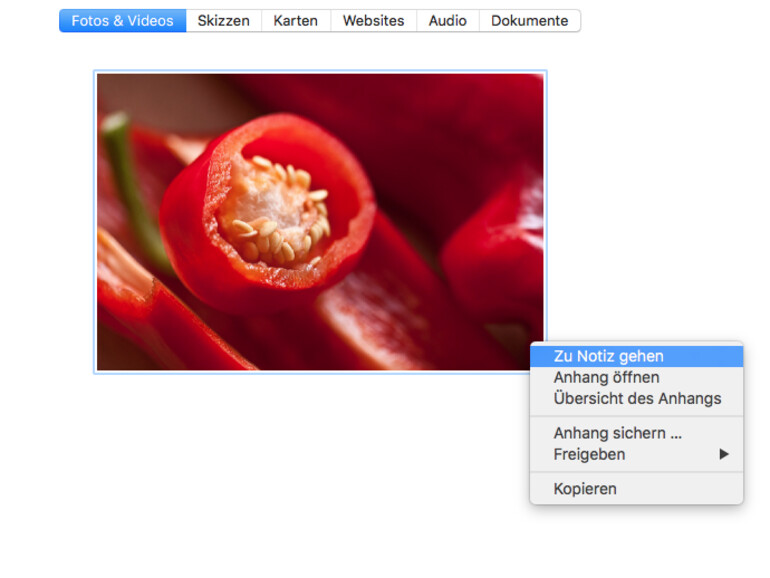 Mit OS X El Capitan werden Notizen multimedial. Einen Überblick über all die Fotos, Videos, Karten, Audioschnipsel und sonstige an Ihre digitalen Notizzettel angehängten Dateien lassen sich mit nur einem Klick einblenden. Um alle Anhänge aufzulisten, klicken Sie in der Kopfzeile der Notizen-App auf das zweite Icon von links. Alternativ können Sie die Anhangsübersicht durch gleichzeitiges drücken der Tasten Command und 1 einblenden. Durch einen Rechtsklick auf einen der Anhänge und der Anwahl des Kontextmenü-Eintrags „Zu Notiz gehen“ können Sie direkt die mit dem jeweiligen Anhang verknüpfte Notiz öffnen.