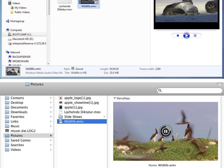 Die Vorschau von Dateien im Spaltenbrowser fand man bereits in Mac OS X 10.0 wieder. Microsoft bediente sich dieses Features in Windows 7. Somit können nun Bilder, Videos und Audio-Dateien auch ohne den Windows Media Player betrachtet werden – für Mac-Anwender ein alter Hut.
