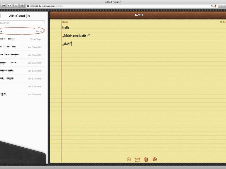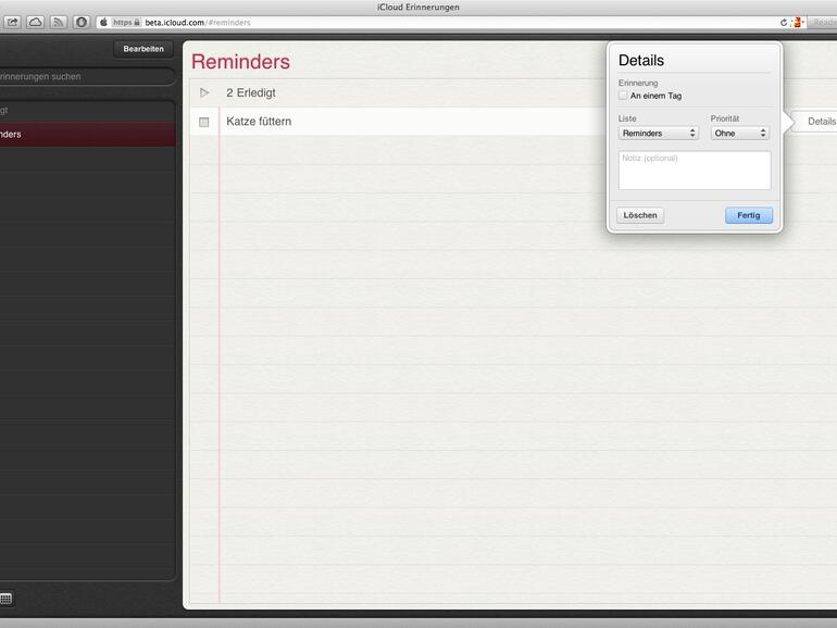 Dass Apple „Erinnerungen“ und „Notizen“ auch auf iCloud.com bereitstellen würde, war bereits vor einiger Zeit bekanntgeworden. Inzwischen hat Cupertino beide Apps jedoch optisch noch ein wenig überarbeitet. Grundsätzlich sind Erinnerungen und Notizen bis auf wenige fehlende Funktionen kaum von ihren OS-X-Pendants zu unterscheiden. Klar, dass Features wie ortsbasierte Erinnerungen in der Web-Ansicht nicht funktionieren. Notizen können zudem ausschließlich mit der Schriftart Noteworthy verfasst werden.