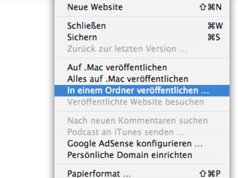 iWeb ist jedoch eng mit dem .Mac-Onlinedienst (sprich Dot-Mac) verzahnt. So kann direkt aus dem Programm heraus eine Web-Site auf .Mac veröffentlicht werden. Doch auch der Benutzer eines anderen Onlinedienstes oder Anbieters bleibt nicht außen vor. Es ist zudem möglich, die erstellte Web-Site in einem lokalen Ordner zu speichern, um sie dann beispielsweise mit einem FTP-Programm auf den entsprechenden Web-Server zu laden.