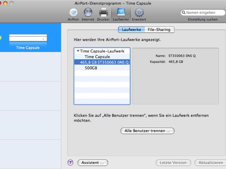 Wenn Sie anschließend auf die Festplatte zugreifen möchten, klicken Sie in der Seitenleiste eines Mac-OS-X-Fensters auf die Freigabe Time Capsule und dann rechts oben auf den Schalter Verbinden als. Nach der Eingabe des Kennworts erscheint das Symbol der Festplatte auf dem Schreibtisch. Die externe Festplatte können Sie übrigens auch als Time-Machine-Laufwerk nutzen oder einfach Dateien und Programme darauf ablegen, die im gesamten Netzwerk zur Verfügung stehen sollen. Das Addieren der beiden Festplatten (der internen von Time Capsule und der externen USB-Festplatte) zu einem Time-Machine-Laufwerk ist hingegen nicht möglich.