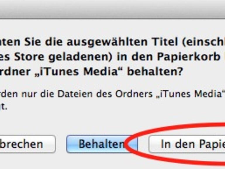Um die lokalen Dateien durch die hochwertigeren Songs aus dem iTunes-Store-Fundus zu ersetzen, gehen Sie wie folgt vor: Wählen Sie die soeben erstellte intelligente Wiedergabeliste in der linken Seitenspalte aus und wählen Sie darauf folgend alle darin enthaltenen Songs (Befehlstaste [cmd] + [A]) aus. Löschen Sie nun die markierten Songs aus der lokalen Mediathek: Drücken Sie hierzu einfach die Rückschritttaste. Wenn Sie gefragt werden, ob Sie die ausgewählten Titel behalten wollen, antworten Sie mit einem Klick auf die In den Papierkorb bewegen-Schaltfläche.