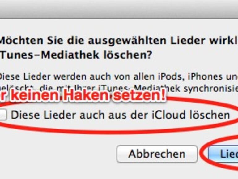 Zudem werden Sie gefragt, ob Sie die Lieder tatsächlich löschen wollen: Klicken Sie hier auf den Lieder löschen-Button. Achten Sie aber darauf auf keinen Fall die Option Diese Lieder auch aus der iCloud löschen anzuwählen: Wenn Sie hier einen Haken setzen, könnten Sie ihre gesamte Musikbibliothek verlieren! Wer sich unsicher ist, sollte vorab ein Backup der eigenen Mediathek erstellen – sicher ist sicher.
