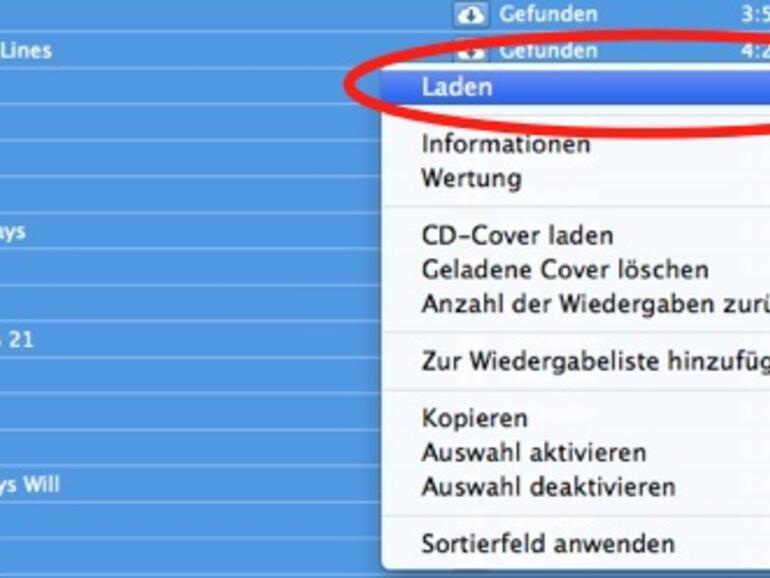 Sind alle in in der intelligenten Wiedergabeliste geführten Songs gelöscht, ändert sich die Statusanzeige: Mit einem Pfeil versehene Cloud-Symbole zeigen an, dass die Titel zum Download verfügbar sind. Wählen Sie nun erneut alle Titel in der Wiedergabeliste aus und öffnen Sie via Rechtsklick das Kontextmenü: Mit einem Klick auf Laden starten Sie schlussendlich den Downloadvorgang für sämtliche Songs.