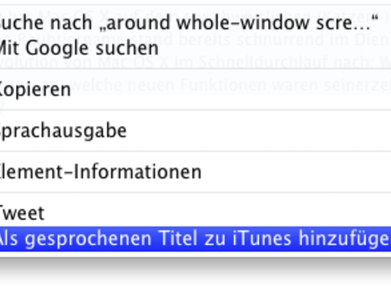 Der Weg zum Podcast „Marke Eigenbau“ ist denkbar einfach. Nachdem ein Text markiert wurde, findet sich im Kontextmenü der Befehl „Als gesprochenen Titel zu iTunes hinzufügen“. Kurz die Systemstimme auswählen, den Namen sowie einen Ort zum Zwischenspeichern festlegen und Lion erledigt den Rest von selbst.