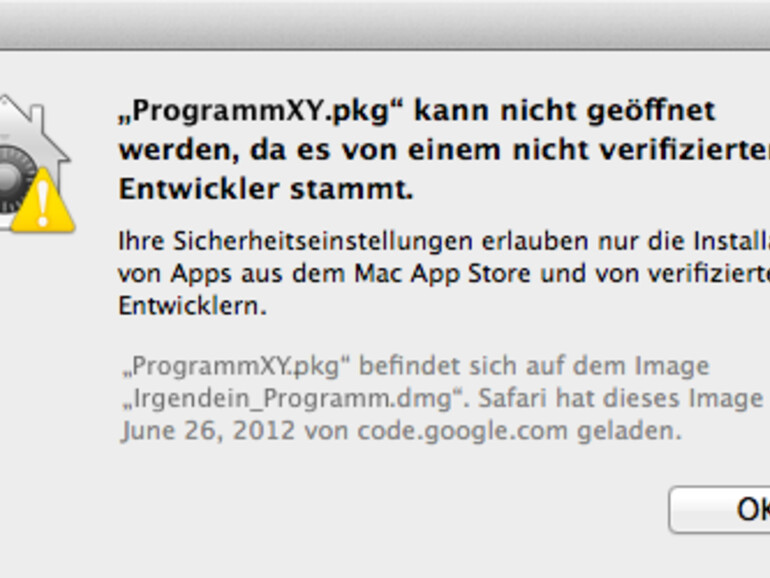 Obwohl Programme nicht eingeschränkt werden sollen, warnt OS X dennoch vor Anwendungen die nicht aus dem Mac App Store oder von registrierten Entwicklern stammen