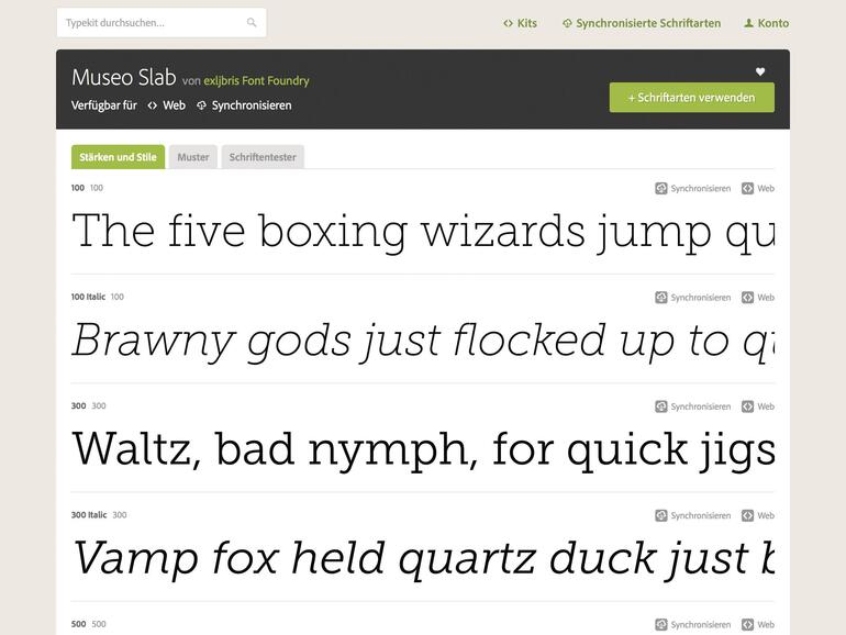 Grundsätzlich gibt es zwei Sorten von Schriften bei Typekit: Fonts fürs Web und für die Synchronisierung. Mit den entsprechenden Buttons unter „Verfügbarkeit“ kannst du die Schriften entsprechend nach dem Einsatzzweck vorsortieren. Für Webschriften gibt Typekit CSS-Code zum Einbetten aus. Schriften zum Synchronisieren können über die Creative Cloud ins System und die Desktop-Programme gelangen. Die Schriften kannst du dann für Print, Web-Entwürfe, Textverarbeitung, Bildmontagen und mehr verwenden.