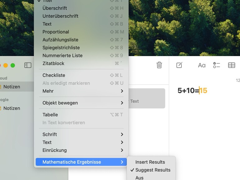 Genauso wie beim iPhone und iPad kommen die praktischen Math-Notes nun auch auf MacOS. Um sie zu benutzen, musst du einfach nur deine Formel in der Notizen-App eingeben und der Mac berechnet automatisch das Ergebnis. Du kannst hierbei wählen, ob du die Ergebnisse nur vorschlagen lassen willst, oder ob du sie automatisch einsetzen lässt. Wenn du diese Funktion gar nicht benutzen möchtest, kannst du sie aber auch deaktivieren.