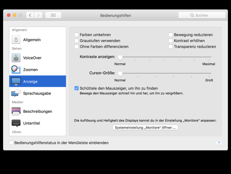 Dass das Feature in den Bedienungshilfen unter „Anzeigen“ auftaucht, erscheint dabei eher merkwürdig, da die Systemeinstellungen über separate Optionen für „Maus & Trackpad“ verfügen und die Funktion in der aktuellen Position Fehl am Platz wirkt und daher leicht übersehen werden kann.