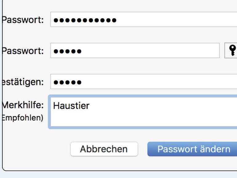 Öffnen Sie dazu „Benutzer & Gruppen“ in den Systemeinstellungen. Klicken Sie links auf Ihren Benutzernamen und dann auf „Passwort ändern“. Mithilfe des Schlüsselsymbols rufen Sie den Kennwortassistenten auf.