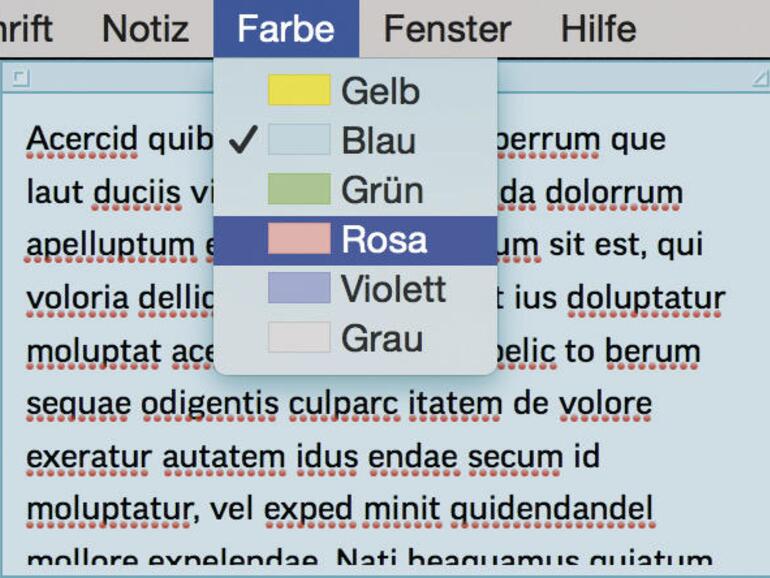 Mit der App Notizen synchronisieren Sie Einkaufslisten, spontane Einfälle und andere kurze Texte zwischen all Ihren Apple-Geräten per iCloud. Die App ist entsprechend prominent auf iPad, iPhone und Mac integriert. Zu El Capitan gehört aber auch ein Programm, mit dem Sie die berühmten Haftnotizen auch auf dem Desktop nutzen. Statt die Klebezettel rund um den Monitor zu verteilen, platzieren Sie die Erinnerungen direkt auf der Arbeitsfläche. Starten Sie die App „Notizzettel“ zum Beispiel über Launchpad auf Ihrem Mac. Beim erstmaligen Programmstart blendet die App gleich zwei Notizen mit einführenden Hinweisen ein. Mit einem Klick in die linke obere Ecke des Fensters löschen Sie jederzeit eine Notiz. Die Nachfrage zum Sichern verneinen Sie und schon sind die Zettel verschwunden. Eine neue Notiz legen Sie am schnellsten mit dem Tastenkürzel [cmd]+[N] an. Natürlich geht das auch über den Menüpunkt „Ablage“ > „Neu“. Statt des klassischen Gelbs dürfen Sie auch einen anderen Ton verwenden. Hierzu genügt ein Klick im Menü „Farbe“. Das Programm merkt sich Ihre letzte Einstellung. Ab jetzt werden alle neuen Notizen in der gleichen Farbe angelegt. Über das Menü „Schrift“, das Sie auch als Kontextmenü erreichen, ändern Sie auf Wunsch die Formatierung der Texte. Und ein Doppelklick in die Titelleiste einer Notiz verkleinert diese so, dass sie nur noch wenig Platz auf dem Desktop benötigt. Die Notizen werden beim Beenden der App automatisch gespeichert und beim nächsten Aufruf auch wieder an der vorherigen Position angezeigt. Haftnotizen dürfen sogar transparent erscheinen. Dazu nutzen Sie die Kommandos im Menü „Notiz“. Wenn Sie den Text einer Notiz in einem anderen Zusammenhang benötigen, sichern Sie den Inhalt optional als RTF-Datei. Dazu benutzen Sie „Ablage“ > „Text exportieren“. El Capitan speichert die Inhalte der Stickies in einer zentralen Datenbank. Sie können diese bei Bedarf also auch leicht auf einen anderen Mac übernehmen. Die Datei trägt den Namen „StickiesDatabase“ und liegt im Ordner ~/Library. Die Stickies sind perfekt für alle Kritzeleien und Anmerkungen.