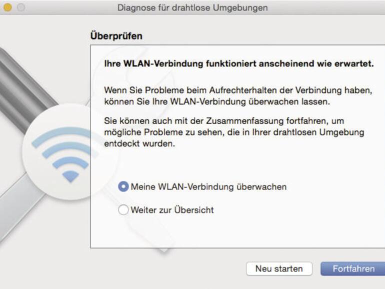 Wenn alles nach Wunsch funktioniert, ist WLAN eine extrem bequeme Sache. Nur leider steckt oft genug der Wurm drin. Verliert Ihr Mac ohne erkennbaren Grund regelmäßig die WLAN-Verbindung oder ist die Datenrate extrem niedrig, obwohl nur ein Gerät angemeldet ist, nutzen Sie am besten ein verstecktes Diagnose-Werkzeug. Sie erhalten damit die Chance, dem Problem auf die Spur zu kommen, zumindest aber liefert die App Daten zurück, mit denen die Supportmitarbeiter von Apple etwas anfangen können. Die App wurde von Apple ganz gut vor unerwünschten Zugriffen versteckt. Klicken Sie mit gedrückter Alt-Taste auf das WLAN-Icon in der Menüleiste. Neben einer ganzen Reihe von zusätzlichen Informationen zur aktuellen Verbindung finden Sie im Menü auch den Eintrag „Diagnose für drahtlose Verbindungen öffnen“. Die Software begrüßt Sie zuerst mit einer kurzen Einleitung. Am Ende der Untersuchung steht ein Bericht, den Sie optional an Apple senden können. Drücken Sie auf „Fortfahren“. Sie müssen nun Ihr Systempasswort eintragen. Gleich im Anschluss beginnt die Software mit der Untersuchung der Verbindung. Sofern es offensichtliche Lösungen gibt, werden diese unmittelbar eingeblendet. Treten während der Untersuchung keine Probleme auf, bietet Ihnen die Software an, den Datenverkehr zu überwachen. Gerade im Fall von eher rätselhaften Abbrüchen kann das hilfreich sein. Lassen Sie das Fenster dazu geöffnet und fahren Sie mit Ihrer Arbeit fort. Tritt ein Problem auf, werden Sie benachrichtigt und es wird ein Eintrag in der Überwachungsdatei angelegt. Möchten Sie die Überwachung oder den Untersuchungsvorgang beenden, klicken Sie auf „Fortfahren“. Zu der Situation können Sie nun noch einige ergänzende Worte hinterlegen. Die Diagnosedatei wird direkt auf dem Desktop angelegt, die Sie dann an Apple weiterleiten oder auf einen externen Datenträger ziehen können.