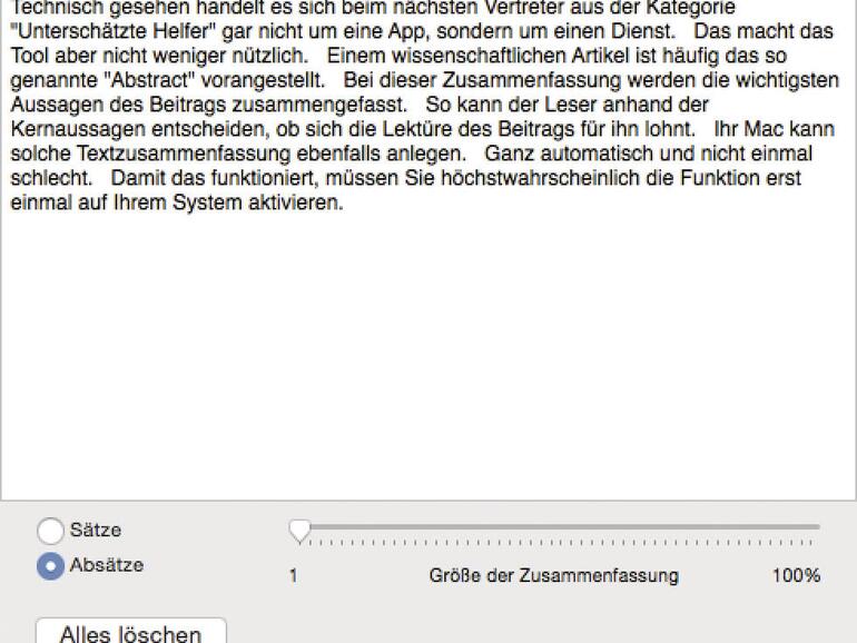 Technisch gesehen handelt es sich beim nächsten Vertreter aus der Kategorie „Unterschätzte Helfer“ gar nicht um eine App, sondern um einen Dienst. Das macht das Tool aber nicht weniger nützlich. Einem wissenschaftlichen Artikel ist häufig das so genannte „Abstract“ vorangestellt. Bei dieser Zusammenfassung werden die wichtigsten Aussagen des Beitrags zusammengefasst. So kann der Leser anhand der Kernaussagen entscheiden, ob sich die Lektüre des Beitrags für ihn lohnt. Ihr Mac kann eine solche Textzusammenfassung ebenfalls anlegen. Ganz automatisch und nicht einmal schlecht. Damit das funktioniert, müssen Sie höchstwahrscheinlich die Funktion erst einmal auf Ihrem System aktivieren.