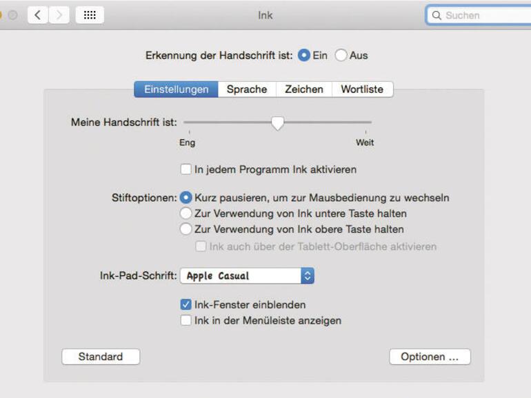 Der App mit dem treffenden Namen „Ink“ werden Sie nur dann begegnen, wenn Sie ein Grafiktablett an Ihren Mac anschließend. Rufen Sie nun die Systemeinstellungen auf. Dort finden Sie jetzt den neuen Eintrag „Ink“. Mit einem Klick aktivieren Sie die Handschriftenerkennung. Die funktioniert auch ohne größeres Training, wenn Sie denn im Register „Sprache“ den korrekten Wert eingestellt haben. Für die Eingabe von Zeichen blendet Ihnen der Mac ein separates Fenster ein. Über die Menüleiste wechseln Sie darin zwischen der Eingabe der Handschrift und der Verwendung des Eingabestifts als Maus. In den Optionen dürfen Sie aber auch festlegen, dass Sie in jedem Programm mit dem Stift Zeichen eingeben können. Dann muss sich der Mauszeiger lediglich über dem jeweils genutzten Programmfenster befinden. Das Ink-Fenster funktioniert wie ein Puffer. Erst, wenn Sie mit der Erkennungsleistung zufrieden sind, drücken Sie auf den Schalter „Send“, um den Text in die aktuell aktive App zu übernehmen. Nutzen Sie dagegen die Option, Handschrift in jeder App zu nutzen, versucht El Capitan die Zeichen unmittelbar zu erkennen. Die Erkennungsleistung ist insgesamt sehr gut. Schreiben Sie innerhalb des Ink-Fensters möglichst groß und in einfachen Druckbuchstaben. Innerhalb des Ink-Fenster schalten Sie mit den beiden Schaltern in der linken unteren Ecke zwischen Handschrifterkennung und Einsatz als Skizzenblock um. Zeichnungen, die Sie per „Send“ an die zuletzt aktive Anwendung übertragen, werden dort über die Zwischenablage als Bild eingefügt.