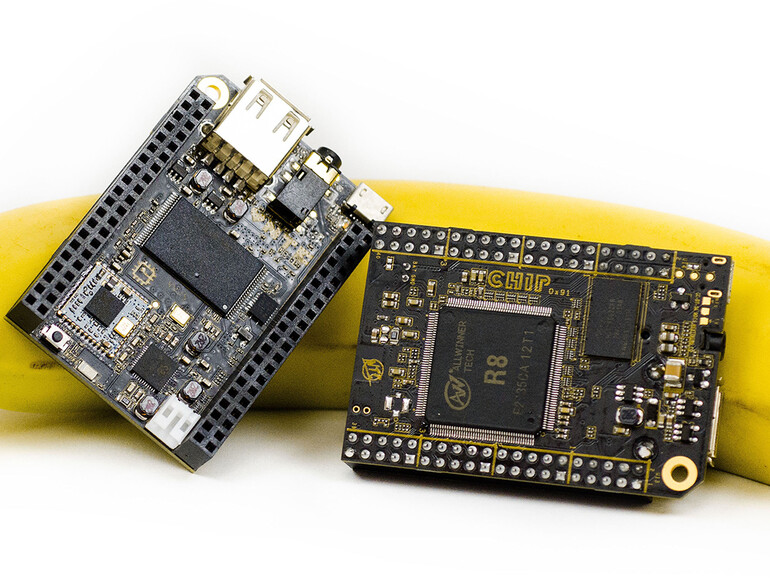 Neben dem Zero gibt es mit dem Chip noch eine weitere Plattform, die praktisch weniger als 10 Euro kostet. Und obwohl die Diskussion eher theoretisch ist, wird es auch darum gehen, welches Board besser für welches Projekt geeignet ist. Technisch spielen Zero und Chip in einer Liga: 512 Megabyte Arbeitsspeicher und 1 GHz Bus-Takt. Allerdings wird der Chip vom moderneren ARMv7 angetrieben. Pi Zero läuft auf ARMv6, der verwirrenderweise als ARM11 bezeichnet wird. Beide Platinen laufen auf 5 Volt und lassen sich über Micro-USB mit Strom versorgen. Chip kann ausdrücklich auch von einem Lithium-Akku als Backup laufen und besitzt sogar Lade-Elektronik, um diesen aufzuladen.