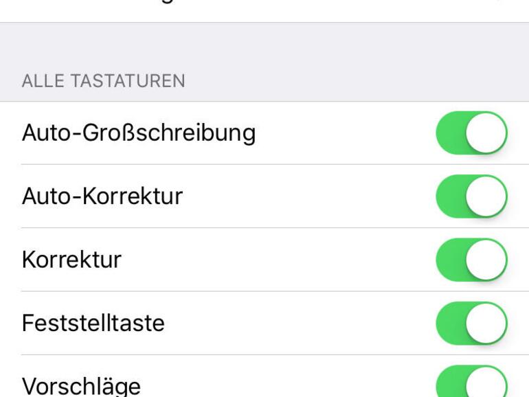 Die automatische Textkorrektur bei der Eingabe ist Fluch und Segen zugleich. Es ist zwar nett, wenn Tippfehler gleich behoben werden, aber zum Teil ist die Ersetzung von Wörtern auch eine echte Plage, wenn iOS beim Raten des gewünschten Wortes mal wieder komplett danebenliegt. In den Einstellungen kannst du unter „Tastatur“ diverse Korrekturfunktionen einzeln ausschalten. Dazu gehören die Großschreibung nach Punkten oder die „Auto-Korrektur“, deren Vorschläge mit dem nächsten Leerzeichen automatisch übernommen werden. Die „Korrektur“ markiert dagegen nur vermeintlich falsche Wörter mit einer roten Wellenlinie, sodass man diese antippen und ersetzen kann. Nicht jedermanns Sache sind auch die vorgeschlagenen Wörter oberhalb der Tastatur. Diese lassen sich mit „Vorschläge“ abschalten.