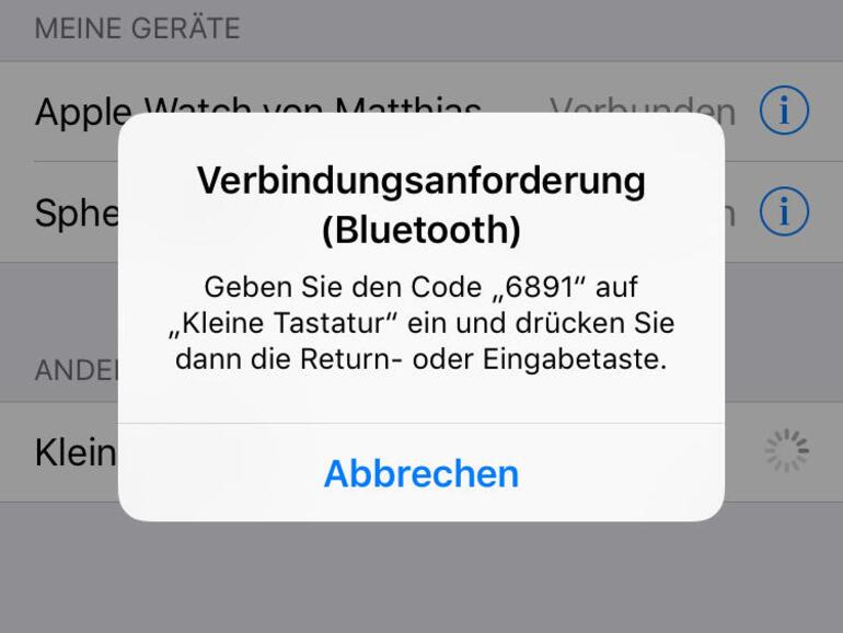 Für die Anmeldung öffnest du in den Einstellungen den Bereich „Bluetooth“. Schalte die Funktion ein, falls noch nicht geschehen. Das iPhone oder iPad sucht nun nach Geräten. Bei einer Apple-Tastatur reicht es, sie einzuschalten, bei anderen Modellen musst du eventuell für die Verbindungsaufnahme eine Taste drücken. iOS sollte die Tastatur nun unter „Andere Geräte“ anzeigen. Tippe darauf. Dann wirst du aufgefordert, zur Identifizierung der Tastatur einen Code einzugeben. Hat die Anmeldung geklappt, schließe die Einstellungen wieder. Die Anmeldung ist nur beim ersten Mal nötig. Von da an erkennen sich die Geräte automatisch.