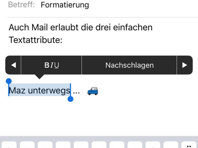 Apps, die für die Eingabe die Standardtextfunktionen von iOS nutzen, erlauben dadurch die einfachen Attribute „fett“, „kursiv“ und „unterstrichen“. Dazu markiert man einfach den Textbereich. iOS blendet dann ein Kontextmenü ein. Darin findest du den Befehl „BIU“, über den du eine Formatierung wählen kannst. Eventuell musst du erst auf den Pfeil am rechten Rand des Menüs tippen, damit die Textoptionen angeboten werden. Die Formatierungen lassen sich natürlich auch kombinieren. So lassen sich zum Beispiel Texte in Mail und Notizen ganz einfach etwas ansprechender gestalten.