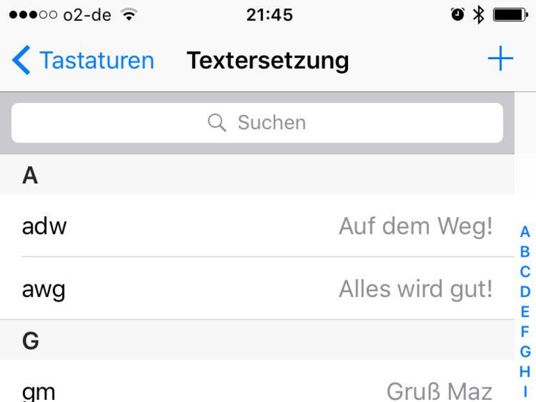 Einige Textfloskeln braucht man in Nachrichten und E-Mails immer wieder. Damit man sie nicht ausschreiben muss, bietet iOS die Textersetzung, zu finden in den Tastatureinstellungen. Sie wandelt „mfg“ bei Eingabe des anschließenden Leerzeichens in das unvermeidliche „Mit freundlichen Grüßen“. Aber du kannst auch eigene Kürzel anlegen, die dann übrigens über iCloud mit deinen anderen Geräten synchronisiert werden. Dazu tippst du oberhalb der Liste auf das Pluszeichen, gib dann den Text und darunter den gewünschten Kurzbefehl an. Die vorhandenen Kürzel werden in der Übersicht nach Anfangsbuchstaben gruppiert.