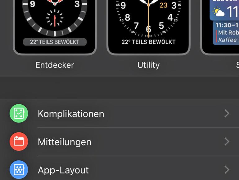 Wenn Ihnen die Bearbeitung der Zifferblätter auf der Uhr zu fummelig ist, können Sie dafür auch die Watch-App auf dem iPhone benutzen. Sie bietet die bessere Übersicht auf dem großen Display. In vielen Fällen sehen Sie direkt die verfügbaren Optionen, wie zum Beispiel Farben, während Sie diese auf der Uhr erst durchblättern müssen. Sie können auch deren Reihenfolge ändern. Für das Anlegen neuer Zifferblätter wechseln Sie in der iOS-App von „Meine Uhr“ in „Zifferblätter“.