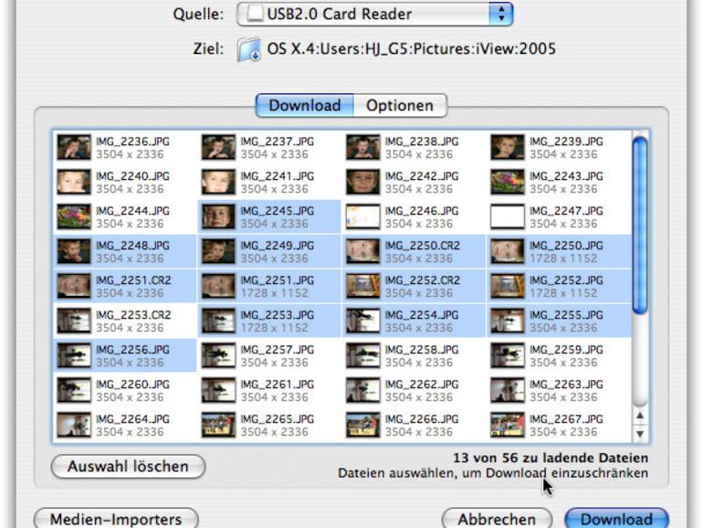 Das Importieren neuer Daten ist wesentlich komfortabler geworden. iView zeigt nun Vorschaubilder an, es lassen sich einzelne Dateien auswählen und importieren. Die Bilder können gleich beim Import automatisch umbenannt werden. Gleichzeitig lassen sich Metadaten erzeugen.