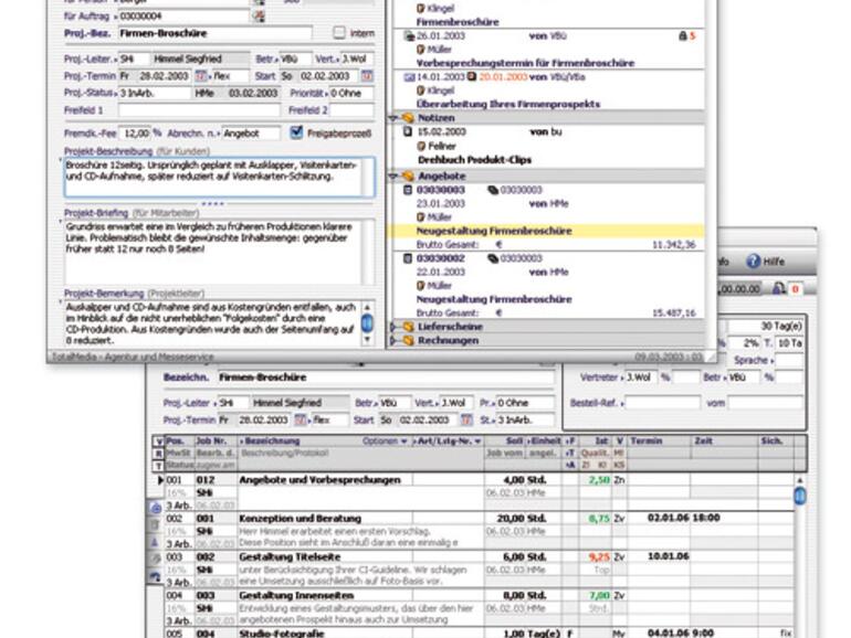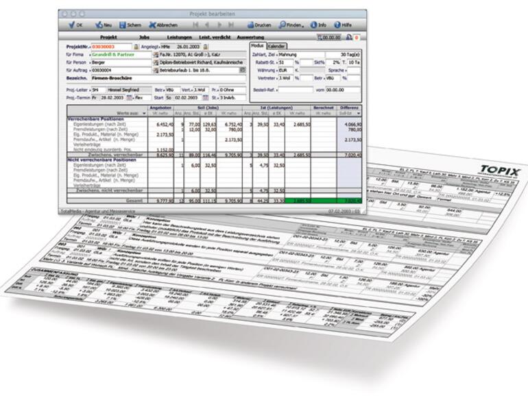 Ein typischer Projektablauf beginnt in Topix:5 mit der Erstellung eines Angebots. Zur Kalkulation der Angebotspreise sollten die einzelnen Leistungen der Jobs erfasst sein, das hat auch Vorteile für die Strukturierung eines Projekts. Im zweiten Schritt wird das Angebot zum Auftrag, und in jedem Fall eine Auftragsbestätigung erstellt, ob an den Kunden verschickt oder nicht. Die Übernahme eines Auftrags in ein Projekt erfolgt im dritten Schritt. Idealerweise müssen nun nur noch die Mitarbeiter und Termine festgelegt werden. Die vierte Phase ist von der Abwicklung und Leistungserfassung geprägt, wobei Topix:5 durch die umfangreiche Informationssammlung seine Karten ausspielt. Im fünften Schritt wird der Ablauf kontrolliert, und den Abschluss bildet sechstens die Abrechnung entweder durch Umwandlung der Auftragsbestätigung in eine Rechnung oder durch Aufbereitung der gesammelten Einträg in der Leistungserfassung.