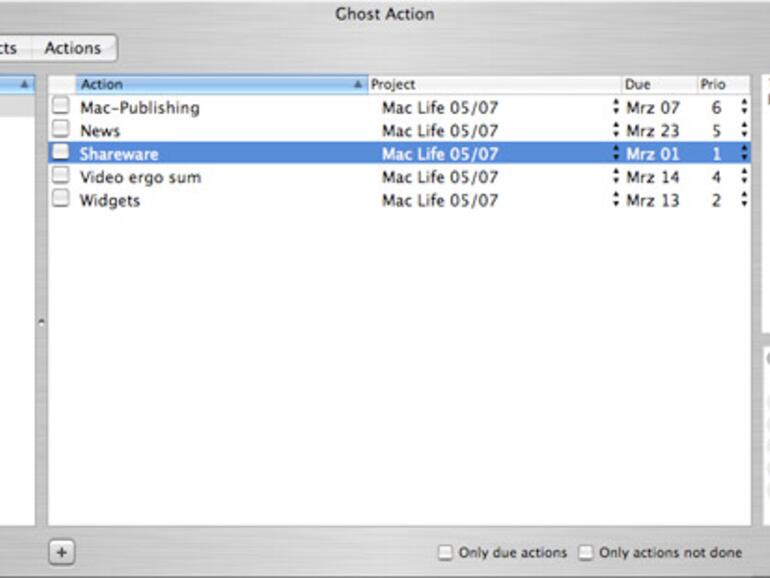 Ghost Action ist Teil dieser Software-Schwemme und präsentiert sich nach dem Start recht schlicht mit einem dreigeteiltem Hauptfenster. Jede Aktion wird einem Projekt und einem Kontext zugeordnet. Im Fall eines Artikels für die Mac Life wäre die Aktion beispielsweise „Shareware“, das Projekt die aktuelle Ausgabe und der Kontext der übergeordnete Begriff (Artikel). Über drei Schaltflächen wird zwischen der Kontext-, Projekt- und Aktionsansicht umgeschaltet.