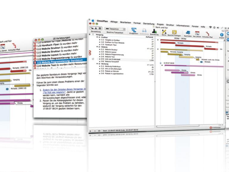Ein Projekt muss in einzelne Arbeitsschritte zerlegt werden, sie lassen sich in OmniPlan einfach mit der Maus in die Zeitleiste einfügen. Durch Verschieben und Verlängern des Balkens wird der Zeitrahmen festgelegt, der für diesen Vorgang eingeplant wurde – eine Datums- und Zeitangabe ist natürlich ebenfalls möglich. Das Zusammenfassen von Vorgängen zu Gruppen hilft die Übersicht bei sehr umfangreichen Projekten zu bewahren. Meilensteine können hier festgelegt werden. Um zu berücksichtigen, dass einige Vorgänge unbedingt vor anderen erledigt werden müssen, lassen sich Abhängigkeiten definieren.