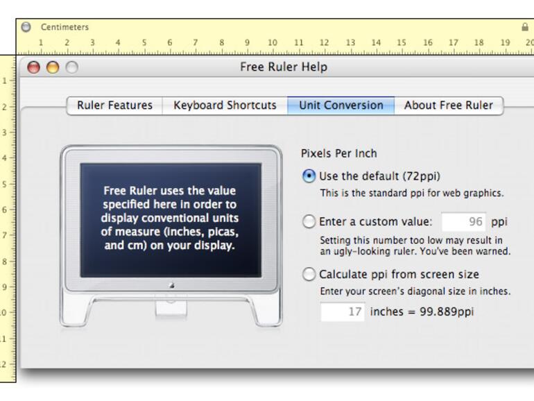 Software-Lineale gibt es für den Mac einige. Ihr Vorteil ist, dass sie alles auf dem Bildschirm abmessen können und nicht auf einzelne Programme beschränkt sind. Nach dem Start von Free Ruler erscheinen zwei Lineale, ein horizontales und ein vertikales. Beide können an ihren Enden in die Länge gezogen oder verkleinert werden. Per Klick auf die Einheit wird zwischen Pixel, Zoll, Pica und Zentimeter umgeschaltet. Bewegt sich der Mauszeiger in dem von den beiden Linealen umrahmten Bereich, zeigen zwei Markierungen die aktuell gemessene Position an, außerdem erscheint diese noch einmal in Textform auf den Linealen.