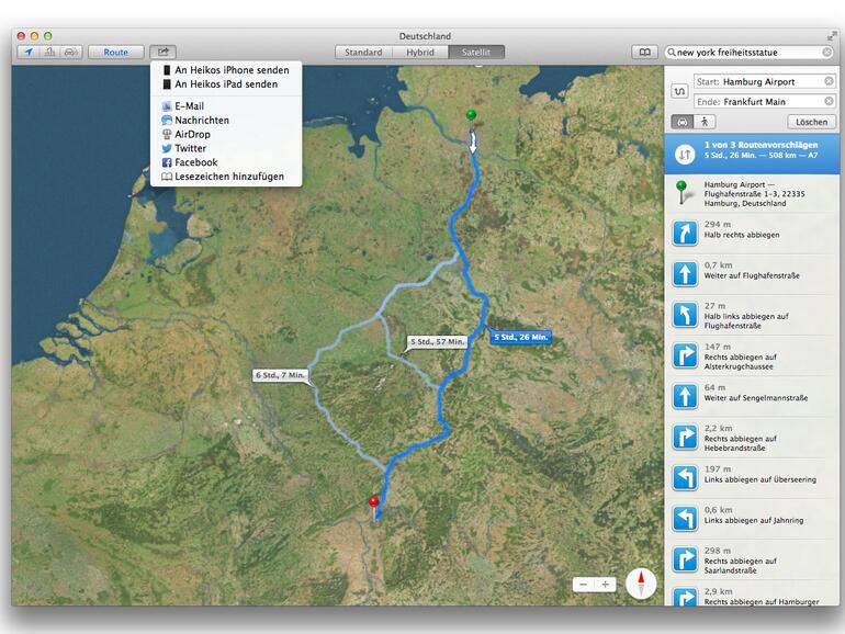 Mit dem Teilen-Knopf in der Werkzeugleiste können Orte und Routen verschickt werden. Das klappt wie unter iOS 7 nicht nur per AirDrop und Nachrichten, sondern auch per E-Mail, Twitter und Facebook. Karten unter OS X 10.9 hat aber noch einen ganz besonderen Trick auf Lager: Die Route kann auch an das eigene iPhone oder iPad geschickt werden. Dort kann der Anwender dann mithilfe der Sprachnavigation zum Ziel geführt werden. Wer hoffte, auch mit dem offenen MacBook auf dem Beifahrersitz durchs Verkehrsgewühl geführt zu werden, wird allerdings ent- täuscht. Karten unter OS X kann nicht sprechen.