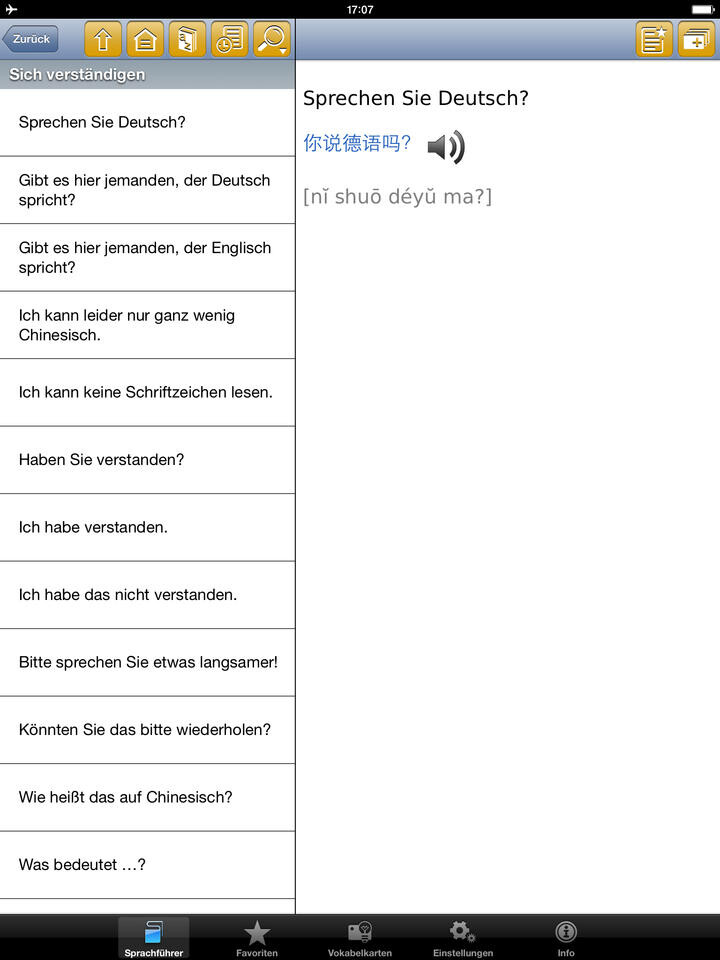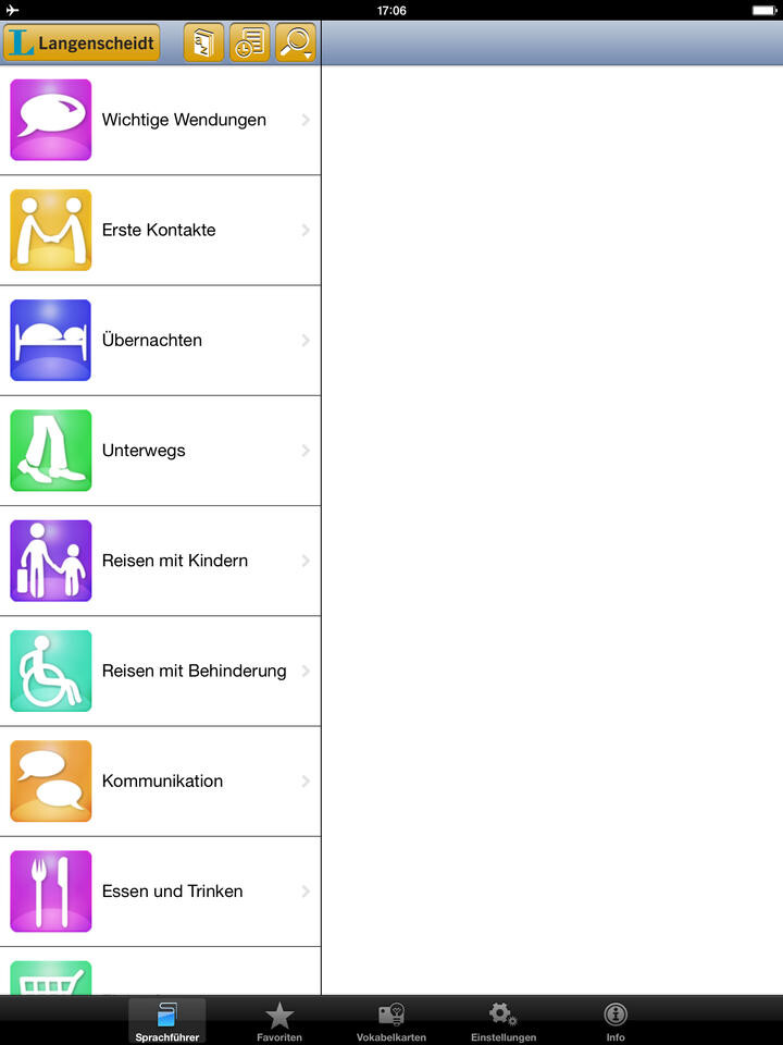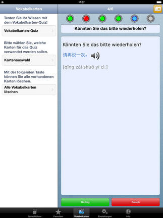 Die besonders für Reisen wichtigen Bereiche sind in Kategorien gegliedert. Neben Wendungen finden Sie hier Begriffe und Sätze zum Thema Übernachten, Reisen mit Kindern, Essen und Trinken und vieles mehr. Die meisten Begriffe enthalten praktischer Weise neben der Lautschrift auch die jeweilige Vertonung. Damit Sie Begriffe später wiederfinden, können Sie diese zu Favoriten oder zur Vokabelkarte hinzufügen. Durch einen Klick auf die Vokabelkarten können Sie Ihr Wissen sogar mit dem Vokabelkarten-Quiz testen. Die Kategorien werden zudem durch nützliche Tipps zum Reisen und alltäglichen Leben in China vervollständigt. Der Sprachführer enthält außerdem ein Reisewörterbuch, das rund 2.100 alphabetisch geordnete Einträge umfasst. Natürlich können Sie in der Suche nach bestimmten Begriffen suchen. Als sehr nützlich erweisen sich außerdem die Zeigebilder, falls die Aussprache zu schwierig ist.