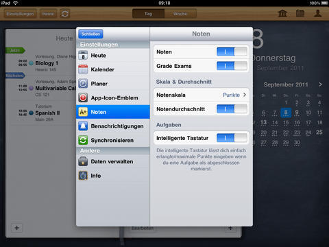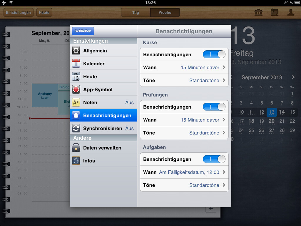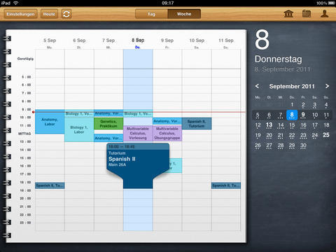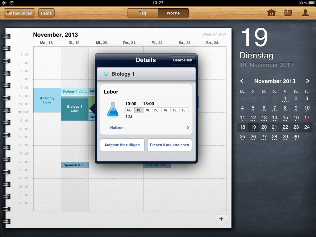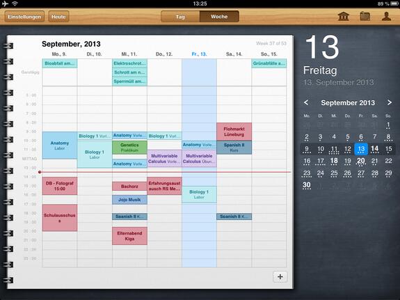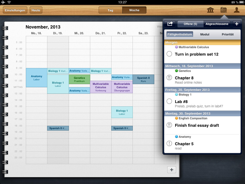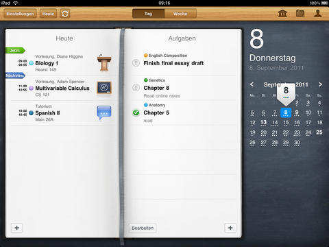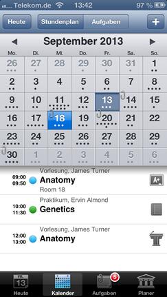 Auf den ersten Blick sieht iStudiez Pro aus, wie jeder andere Kalender auch. Die Darstellung auf iPad und iPhone ist stark unterschiedlich, doch auf beiden Geräten wird das Optimum herausgeholt. Die Monatsansicht, die auf dem iPad immer zu sehen ist, weist bereits auf die anstehenden Termine hin. Unterstützt werden einmalige, wöchentliche, rotierende und Block-Veranstanlungen. Ein Tipp auf das entsprechende Datum öffnet die detaillierte Tagesansicht. Die zeigt die noch anstehenden Termine an, zurückliegende gibt es nur in der Wochenansicht zu sehen. Jedem Kurs fügen Sie, egal in welcher Ansicht, per Fingertipp eine Aufgabenliste inklusive Fälligkeitstermin hinzu. In einem eigenen Abschnitt nennt die App die Aufgaben und erinnert auch rechtzeitig vor deren Ablauf. Schaffen Sie es nicht rechtzeitig, greifen Sie auf die eigene Kontaktliste zu und erfahren hier die Sprechzeiten des Dozenten.
