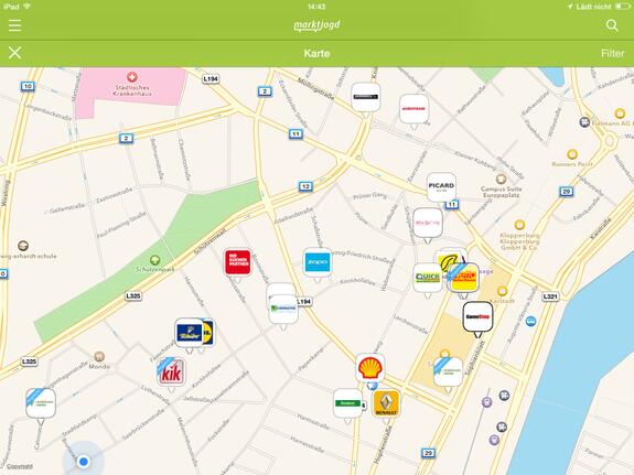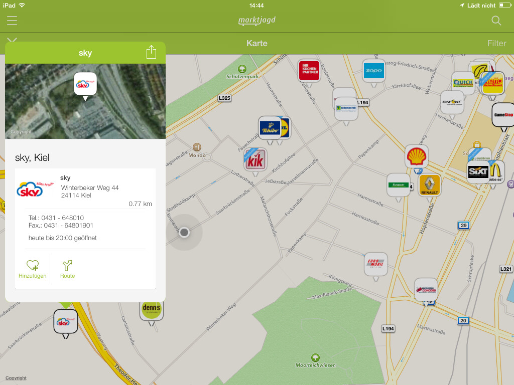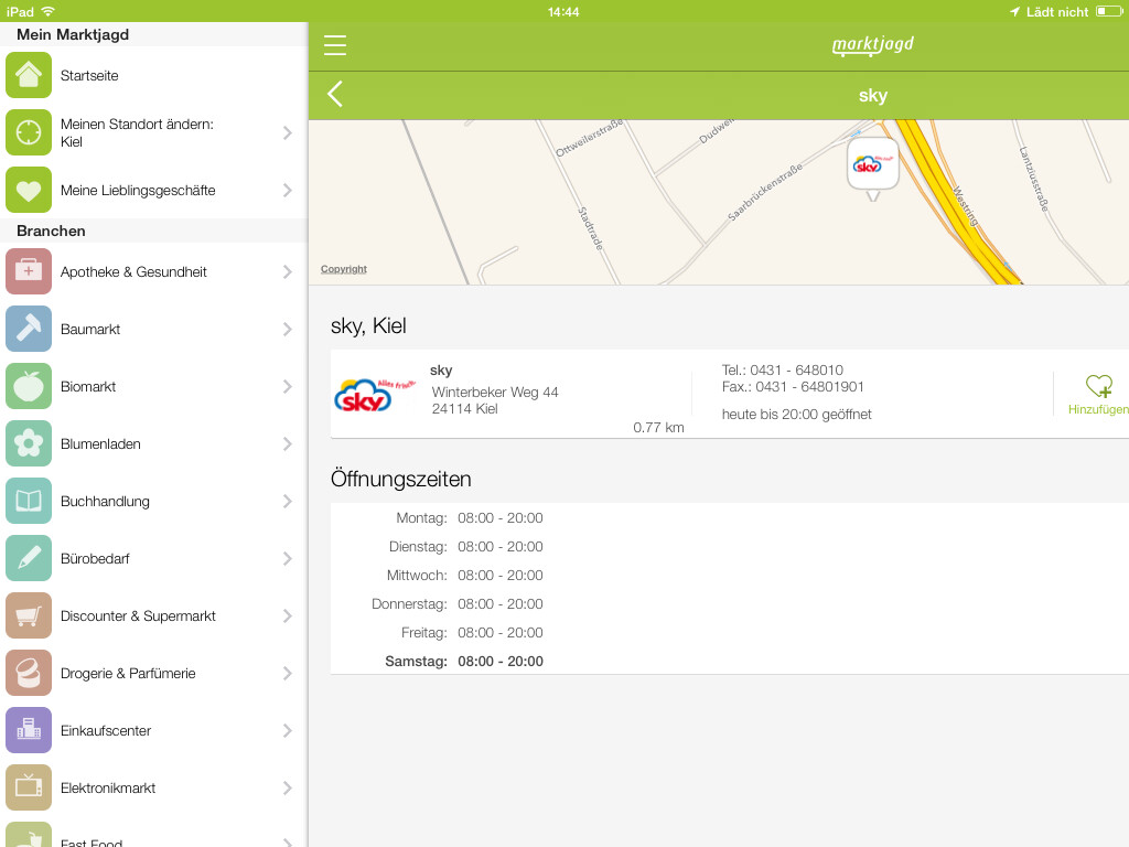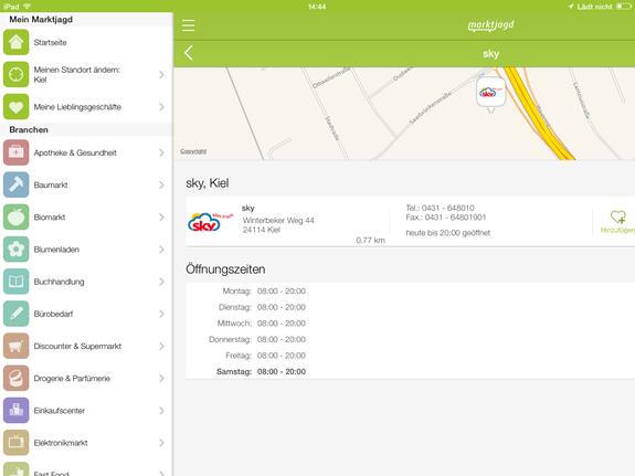 Mit einer gezielten Suche in der umfangreichen Branchenliste bekommen Sie Standorte, Öffnungszeiten sowie Angebote für so ziemlich jeden Laden in Ihrer Nähe. Um Ihnen Läden und Märkte in Ihrer Umgebung anzeigen zu können, benötigt der Marktjagd Einkaufshelfer allerdings auch Zugriff auf Ihren aktuellen Standort. Tippen Sie auf das nächstgelegene Geschäft, so erhalten Sie genauere Informationen. Dazu zählen neben der Adresse und den Öffnungszeiten auch Telefonnummer des Ladens. Außerdem lässt sich Ihre Auswahl zu einer Favoritenliste hinzufügen. Um nicht vom Weg abzukommen, wird Ihnen die Route in Apples Maps angezeigt.