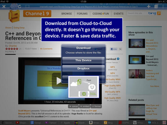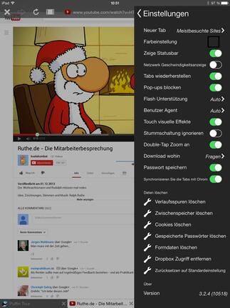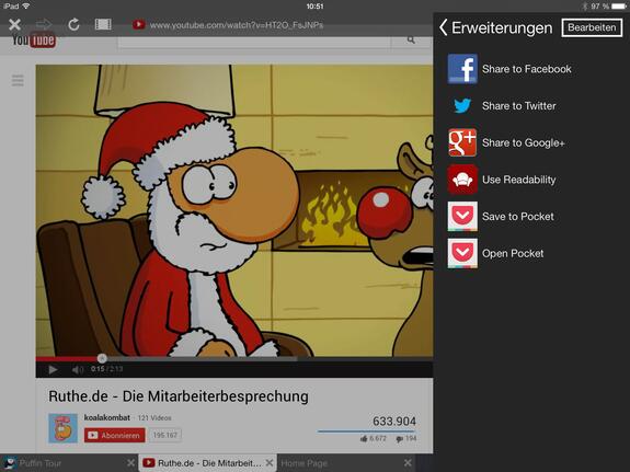 Mit 2,69 Euro ist der Puffin Web Browser nicht gerade ein Sonderangebot. Deshalb empfiehlt der Hersteller vor dem Kauf auch ausdrücklich, zuvor die kostenlose Version zu testen. Doch Skepsis ist hier nicht angebracht. Puffin macht vom Start weg einen guten Eindruck. Das an Windows 8 Kacheln erinnernde Design verwirrt zwar zunächst ein wenig, aber die großen Buttons bieten eine einfache Navigation. In dieser Kachelform zeigt Puppin Lesezeichen, sowie mit Google-Chrome synchronisierte Tabs an. Die eigenen Tabs ordnet der Browser am unteren Bildrand an. Eine Besonderheit ist der integrierte Flashplayer. Dieser kann Videos inline abspielen oder für eine vergrößerte Darstellung in einem separaten Modul aufrufen. Puffin bietet Erweiterungen, um Links auf Google, Facebook, Twitter und anderen zu teilen. Dateidownloads kann er über das Hersteller eigene Netzwerk direkt in die Dropbox schieben.